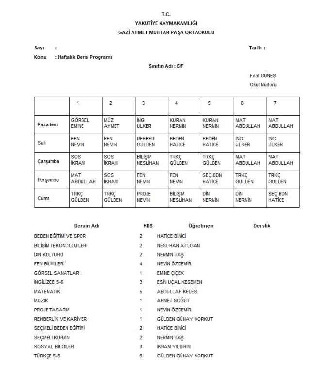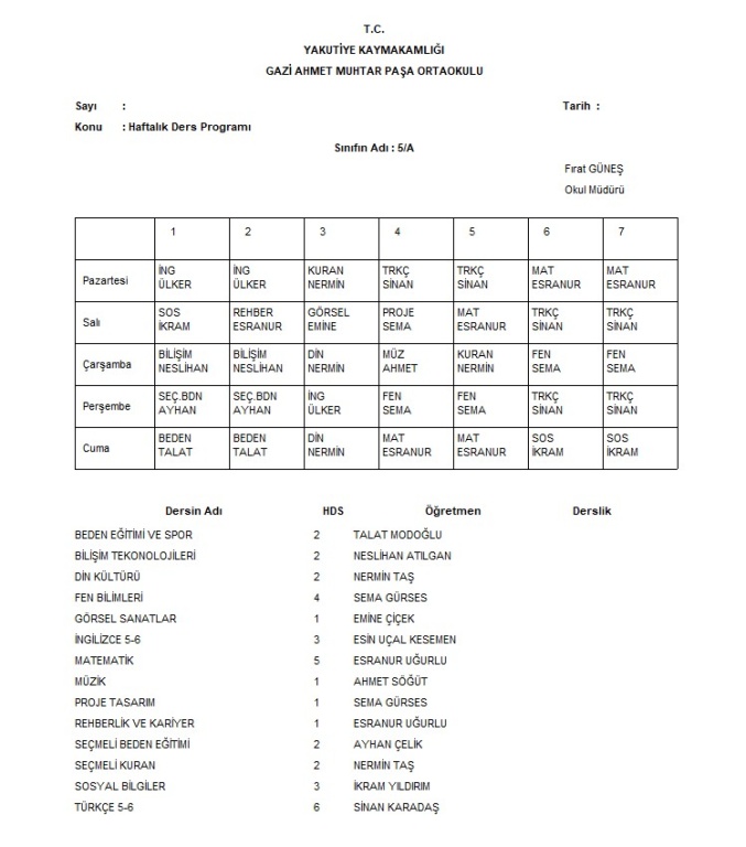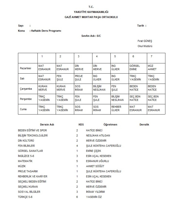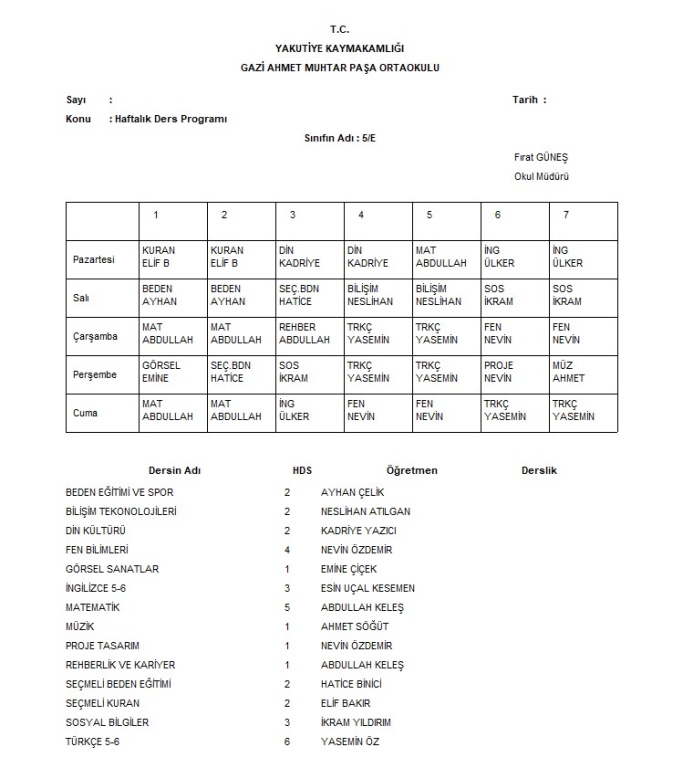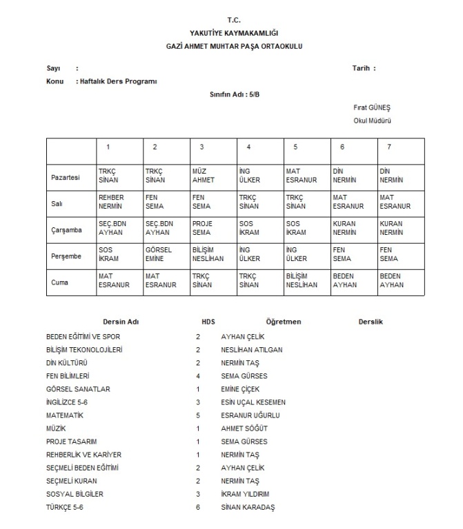 2025-2026 EĞİTİM ÖĞRETİM YILI 5. SINIFLARIN DERS PROGRAMI
